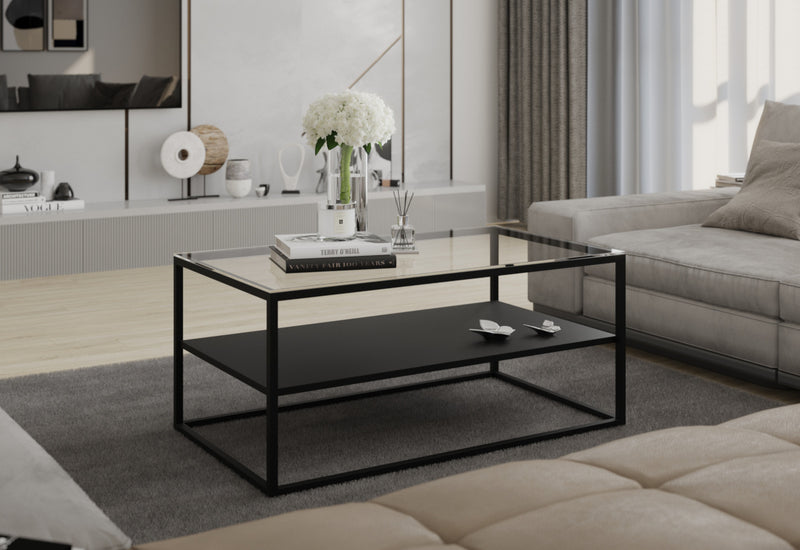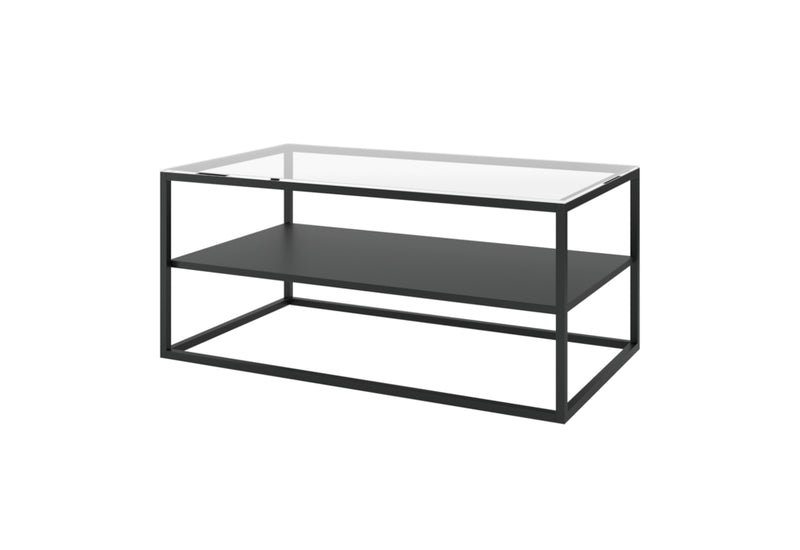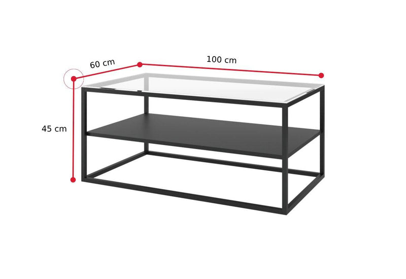Konferenčný stolík MAHONY II. Základ stolíku tvorí kovová konštrukcia v čiernej farbe. Tá zaistí pevnosť, stabilitu a zároveň pôsobí odľahčene a vzdušne. Horná doska je vyrobená z tvrdeného skla o hrúbke 0,4 cm. Ďalšiu alternatívu odkladacej plochy ponúka otvorená polica. Vďaka svojmu atraktívnemu dizajnu v industriálnom štýle sa ľahko stane dominantou každej obývacej miestnosti.