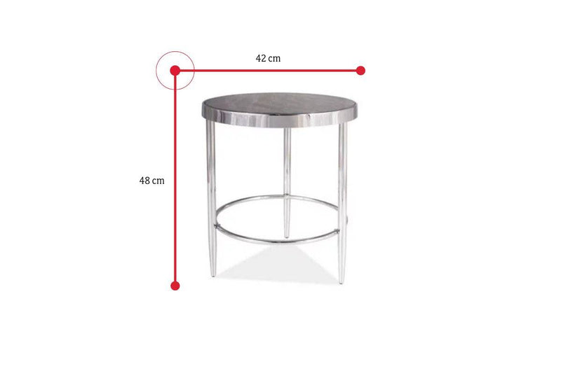 Konferenčný stolík ORAURO C vás zaujme svojim moderným dizajnom. Na kovovej konštrukcii je položená guľatá doska v dekore mramoru a chrómu, ktorá je vyrobená z tvrdeného skla. Nožičky sú pre väčšiu pevnosť vystužené guľatou vzperou. Kvalitný guľatý konferenčný stolík vás bude tešiť dlhé roky.
