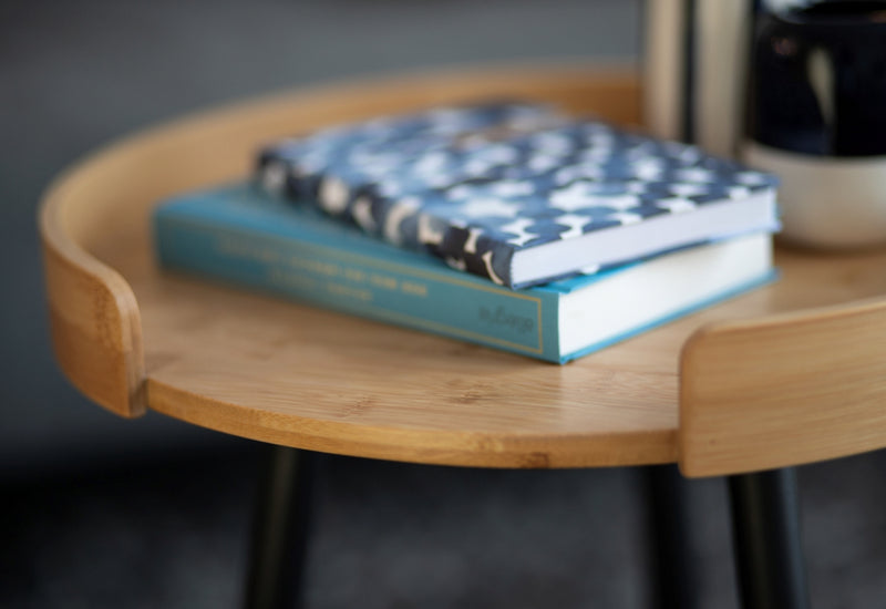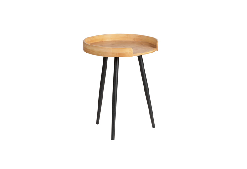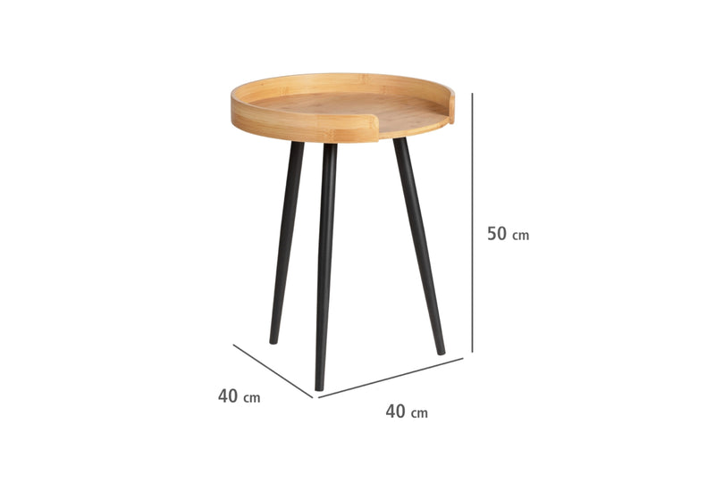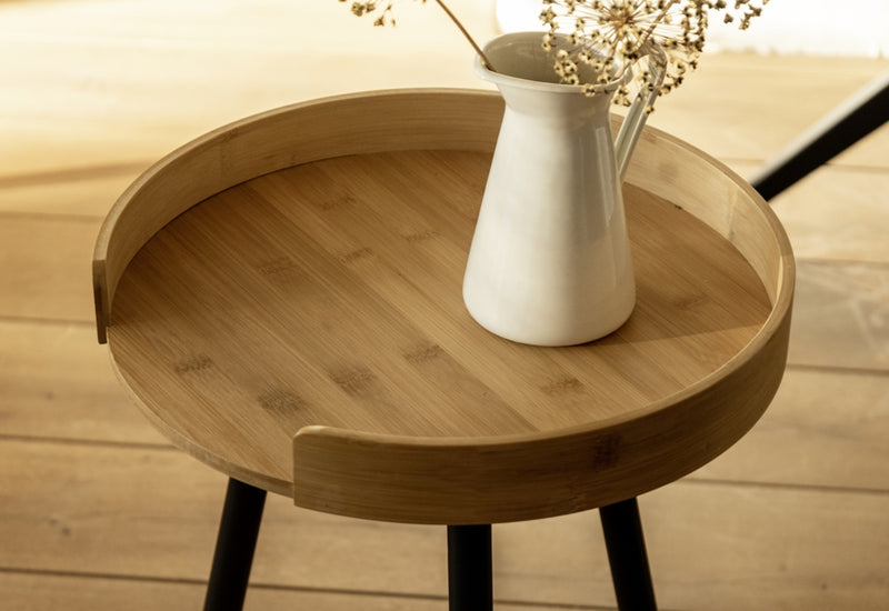 Konferenčný stolík PAULETA. Upúta okrúhlym tvarom a elegantným vzhľadom v industriálnom štýle. Vyrobený je z udržateľného bambusu. Disponuje odkladacou plochou so zvýšenou hranou. Stabilitu a pevnosť zaisťujú vysoké kovové nožičky v čiernej farbe. Jeho využitie je vhodné nielen v obývacej izbe, ale aj v spálni alebo v predsieni.