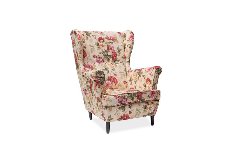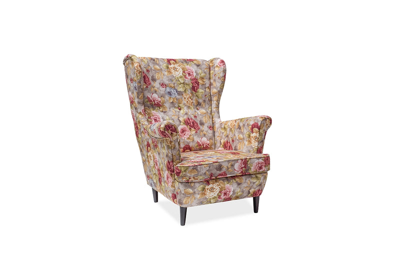 Kreslo ARISTO Coral. Kvalitné čalúnenie a tvar kresla ponúka pohodlie pri odpočinku a relaxáciu. K čalúneniu je použitá poťahová látka s kvetinovým motívom. Je veľmi príjemná na dotyk. Chrbtovú opierku zdobia dekoračné gombíky. Kontrastné nožičky v tmavo hnedej farbe zaistia pevnosť a stabilitu. Môžete vybrať z niekoľkých farebných prevedení.