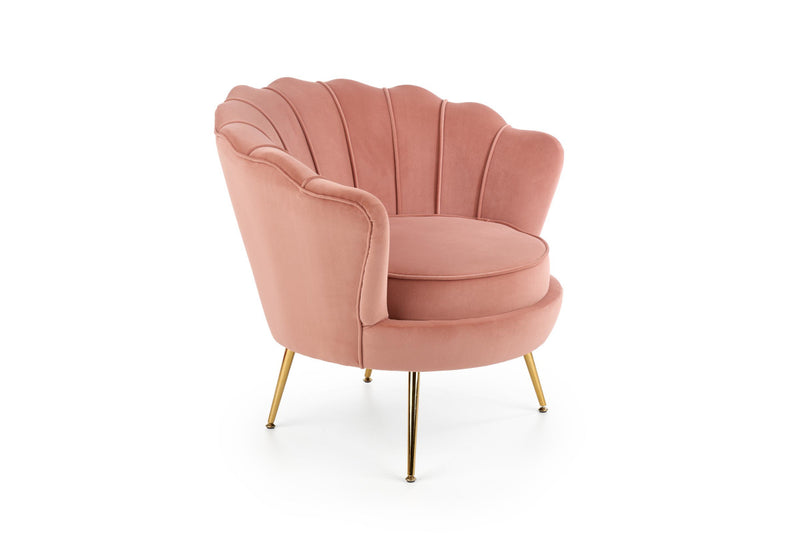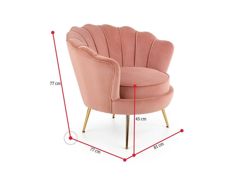 Kreslo CORELI. Elegantné kreslo v tvare mušle. Potiahnuté je zamatovou látkou a zdobené výrazným prešitím. Kvalitná výplň z PUR peny ponúka pohodlie pri odpočinku a relaxácii. Vyššie nožičky sú vyrobené z chrómovej ocele v zlatej farbe, ktoré zaistia stabilitu a vzdušnosť. Možnosť výberu z viacerých farebných variantov.