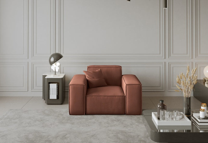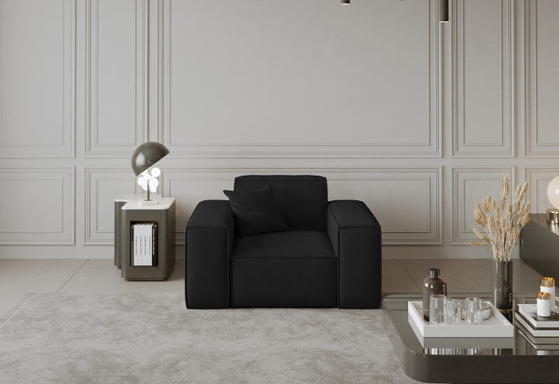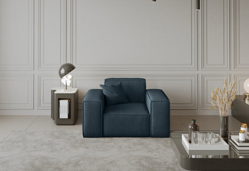Kreslo LUNGO. Jednoduchý robostný vzhľad v modernom dizajne. Kreslo je vyplnené v kombinácii kvalitnej peny a pružín faliste, ktoré ponúka pohodlie pri odpočinku a relaxácii. Kreslo je celočalúnené, vhodné aj do priestoru. Súčasťou je jeden dekoračný vankúšik. Možnosť výberu z viacerých čalúnení. Čalúnenie scala ocean je menčester.