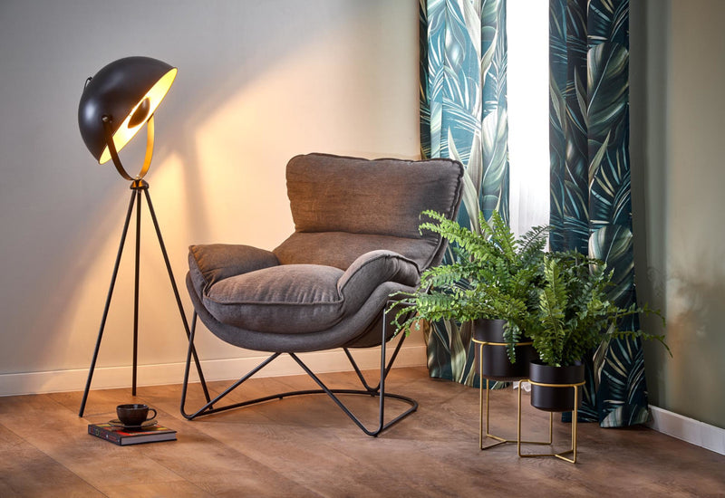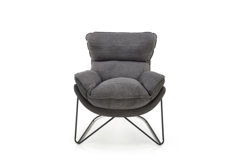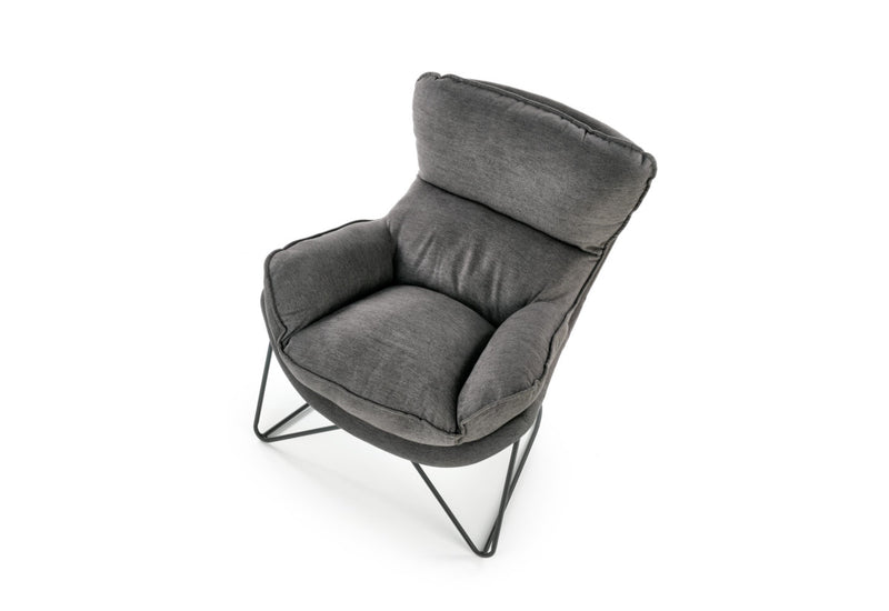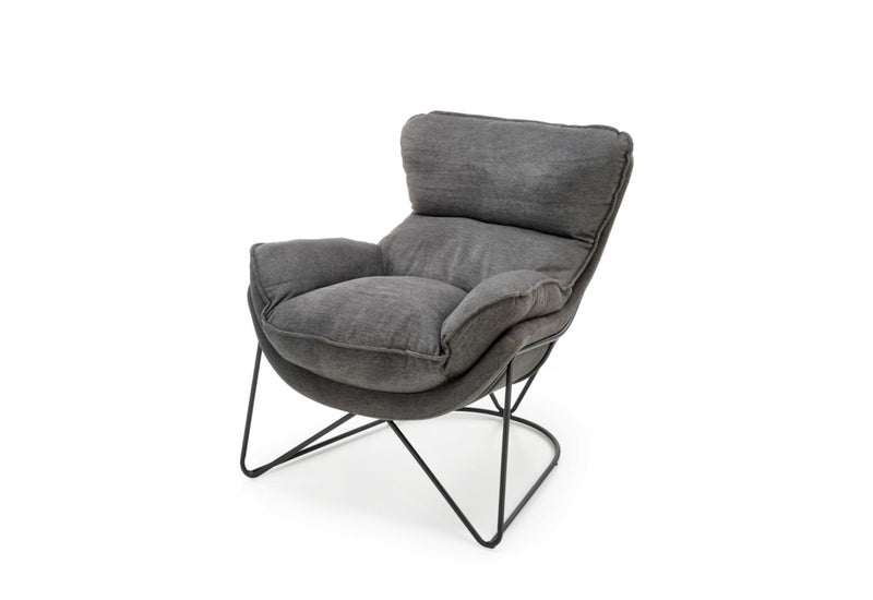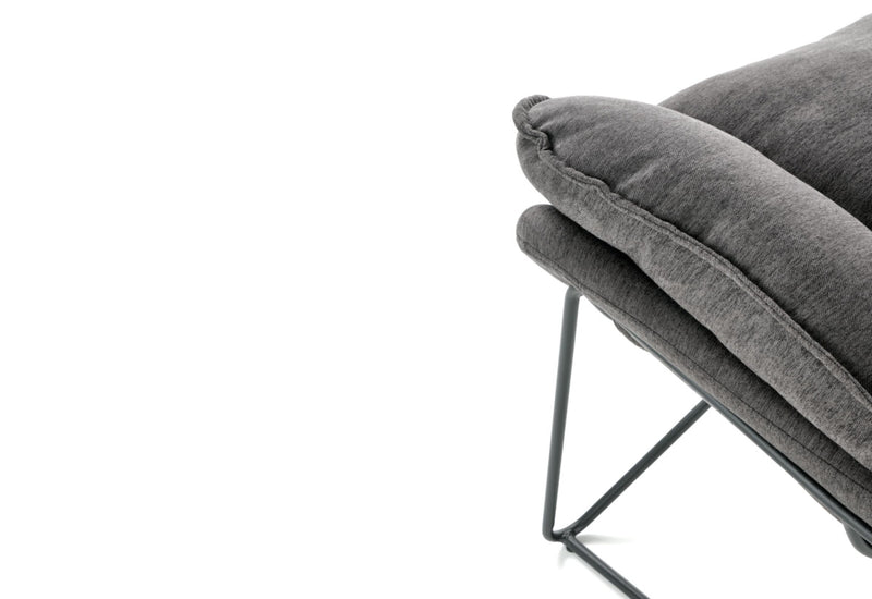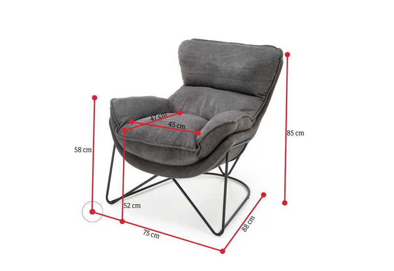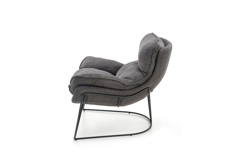 Kreslo VOLIKA. Elegantný a atraktívny vzhľad v industriálnom štýle. Čalúnené je látkou v tmavo šedej farbe, ktorá je príjemná na dotyk. Zdobené je jemným prešitím. Vďaka svojmu polstrovaniu ponúka pohodlie pri odpočinku a relaxácii. Kovová konštrukcia v čiernej farbe zaistí pevnosť a stabilitu. Vhodné do obývacej izby aj pracovne.