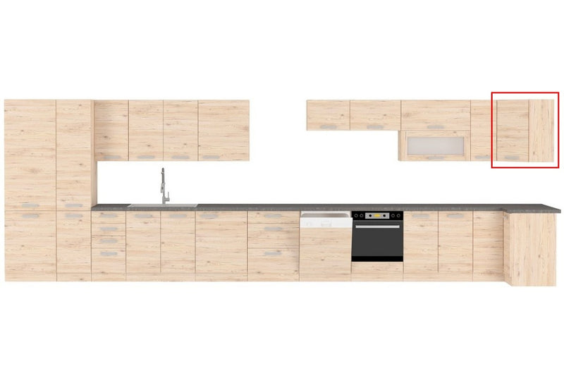 Kuchynská skrinka horná rohová TOULOUSE je vyrobená z lamina, ktoré pred poškodením chráni hrana PVC. K dostaniu je v prírodnom dekore dub Bordeaux. Zaujal vás tento štýl kuchyne? Potom si určite pozrite aj ďalšie komponenty TOULOUSE.