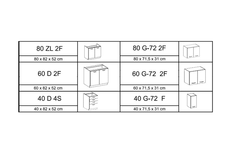 - dolné skrinky: 80 ZL 2F BB, 40D 4S BB, 60D 2F BB