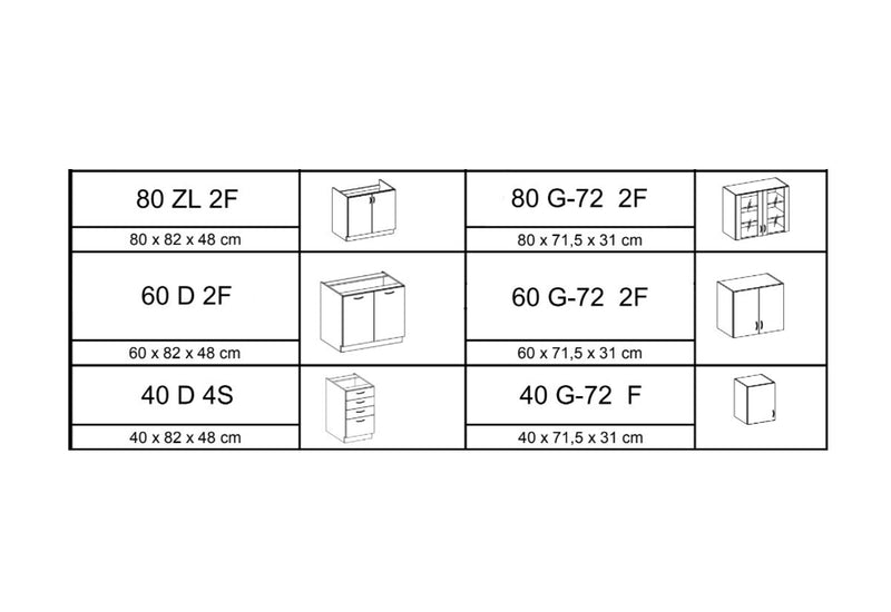 - dolné skrinky: 80 ZL 2F BB, 40D 4S BB, 60D 2F BB