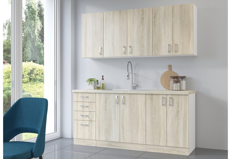 Kuchynská zostava AVRIL 180 PLUS je vyrobená z kvalitného lamina. Hĺbka spodnej časti je 48 cm a vrchnej časti 31 cm. Skladá sa zo šiestich skriniek, z ktorých jedna disponuje aj štyrmi zásuvkami. Všetko je k dispozícii pochopiteľne vrátane úchytov. K zostave je možné prikúpiť aj kuchynský drez s rozmermi 76x43,5.