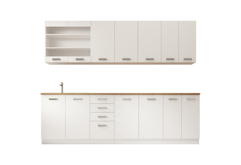 Kuchynská zostava BABLE 2. Vyrobená je z kvalitného materiálu s hrúbkou 1,6 cm s hranou ABS, ktorá chráni pred poškodením. Hĺbka spodnej časti je 52 cm a vrchná 31 cm. Súčasťou je pracovná doska, jej dĺžka je 260 cm, hrúbka 2,8 cm a hĺbka 60 cm. Pracovná doska sa dodáva v jednom kuse. Celý komplet sa skladá z ôsmich skriniek, z ktorých jedna disponuje zásuvkami. Vybavené úchytmi pre ľahšiu manipuláciu.