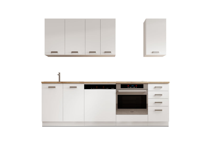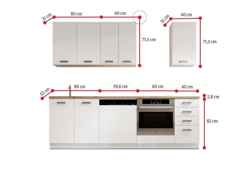 Kuchynská zostava BABLE. Vyrobená je z kvalitného materiálu s hrúbkou 1,6 cm s hranou ABS, ktorá chráni pred poškodením. Hĺbka spodnej časti je 52 cm a vrchná 31 cm. Súčasťou je pracovná doska, jej dĺžka je 240 cm, hrúbka 2,8 cm a hĺbka 60 cm. Pracovná doska sa dodáva v jednom kuse. Celý komplet sa skladá zo siedmich skriniek, z ktorých jedna disponuje zásuvkami. Vybavené úchytmi pre ľahšiu manipuláciu.