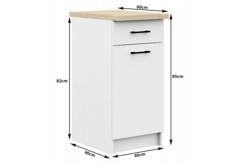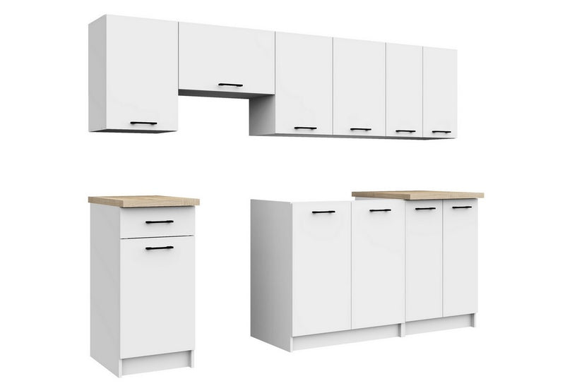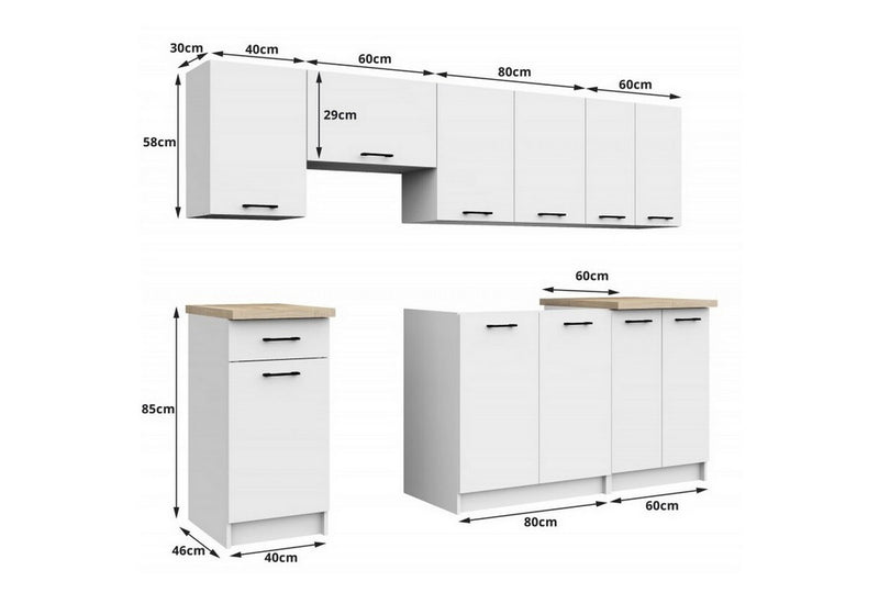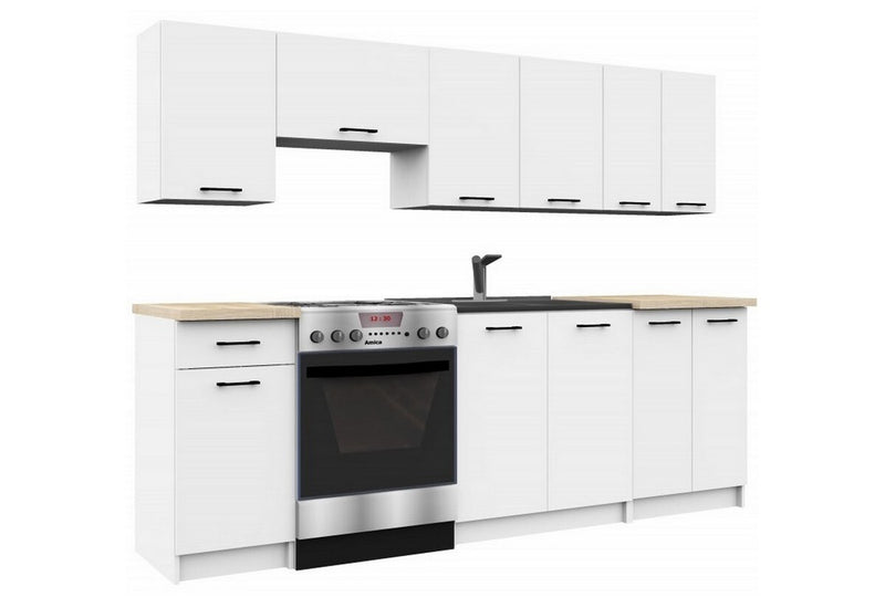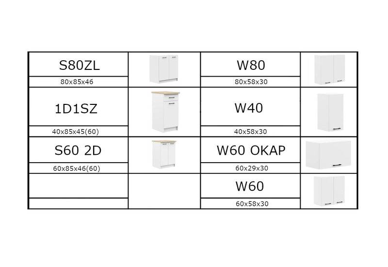 Kuchynská zostava KOSTA 240 je vyrobená z kvalitného lamina v hrúbke 16 mm. Laminátovú dosku chráni pred poškodením hrana ABS. Hĺbka spodnej časti je 60 cm a vrchná 30 cm. Na dvoch skrinkách sa nachádza pracovná doska. Celý komplet sa skladá zo siedmich skriniek, z ktorých jedna disponuje aj zásuvkou na príbory. Všetko je k dispozícii samozrejme vrátane úchytov.