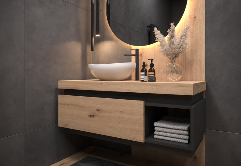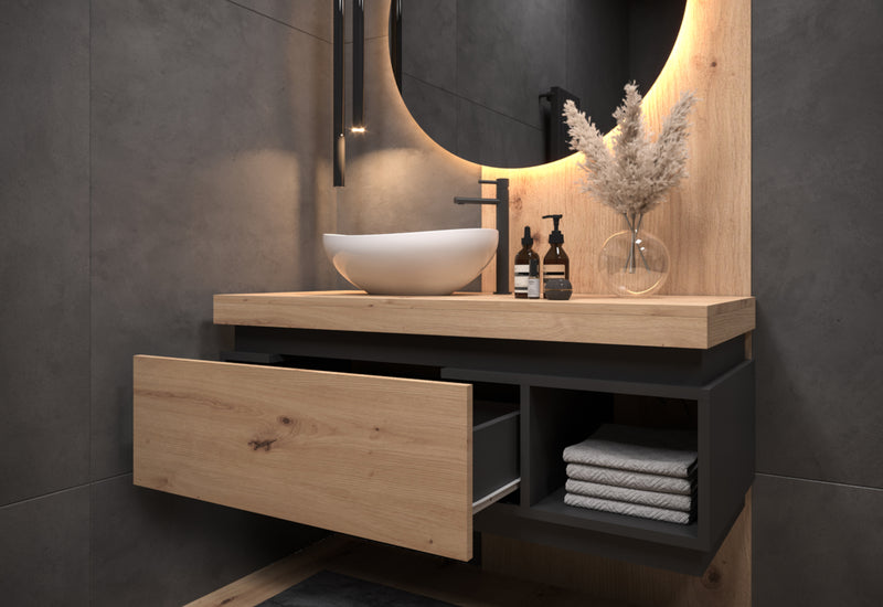 Kúpeľňová skrinka pod umývadlo KADIRA. Je vyrobená z kvalitného materiálu a vybavená ABS hranou. Tá ju chráni pred mechanickým poškodením a vlhkosťou. Skrinka poskytuje dostatok úložného priestoru v podobe jednej zásuvky a jednej otvorenej police. Čelo zásuvky a horná doska je v dekore dreva dub lefkas. Skrinka je určená na montáž na stenu. Balenie neobsahuje umývadlo, batériu ani sifón. Odporúčame kombinovať s ďalšími produktmi z toho istého radu.