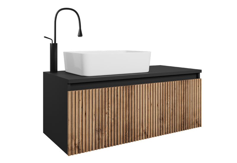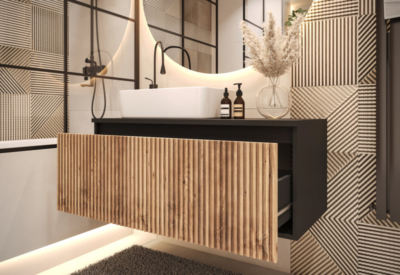 Kúpeľňová skrinka pod umývadlo WOTANA. Je vyrobená z kvalitných materiálov a vybavená ABS hranou, ktorá chráni pred mechanickým poškodením a vlhkosťou. Skrinka poskytuje dostatok úložného priestoru v podobe jednej zásuvky, ktorej čelo je nápadito zdobené. Skrinka vhodne kombinuje dekor dreva dub wotan s čiernou farbou a prípadne si ju môžete doplniť o štýlové umývadlo vrátane batérie a sifónu.