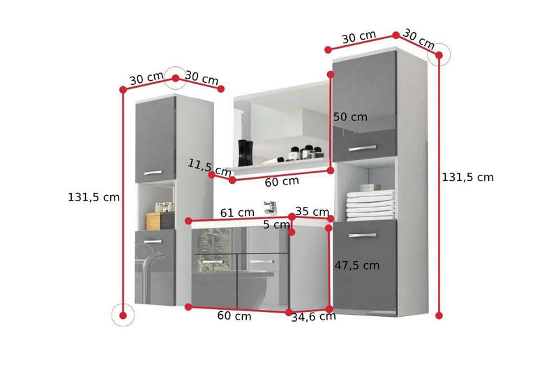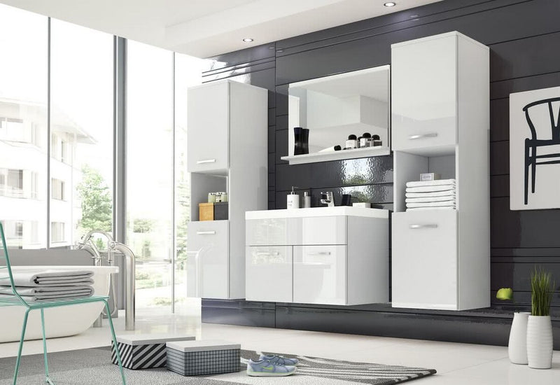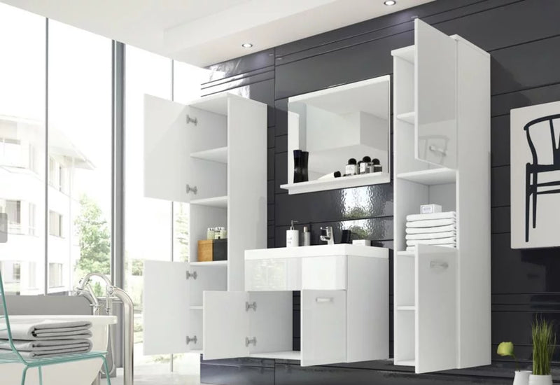 - 2x závesný regál, skrinka s umývadlom a zrkadlo s policou