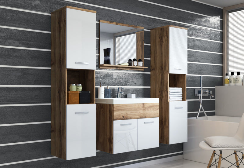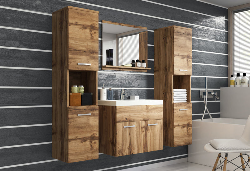 Kúpeľňová zostava BOTTON XL je vyrobená z kvalitného materiálu s ABS hranou. Táto kombinácia chráni nábytok pred poškodením. Zostavu tvorí 2x závesný regál, skrinka s umývadlom a zrkadlo s policou. Veľkou výhodou je možnosť výberu dekoru. Všetky varianty majú matný korpus.