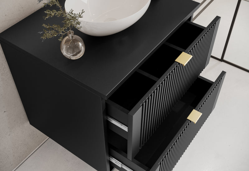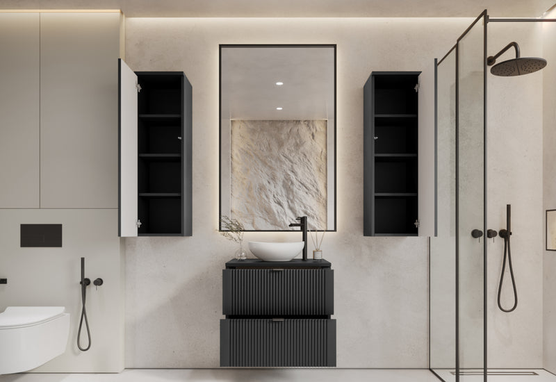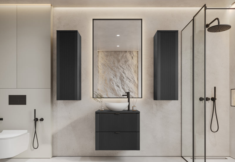 Kúpeľňová zostava DAKARI. Je vyrobená z kvalitného materiálu a vybavená ABS hranou. Tá ju chráni pred mechanickým poškodením a vlhkosťou. Zostava poskytuje dostatok úložného priestoru. Každá závesná skrinka má tri poličky za dvierkami. Skrinka pod umývadlo má dve zásuvky. Zostava je určená na montáž na stenu a môžete vybrať z dvoch farebných prevedení úchytiek. Súčasťou dodávky je skrinka pod umývadlo a dve závesné skrinky. Možnosť zakúpenia zostavy vrátane umývadla, batérie a sifónu.