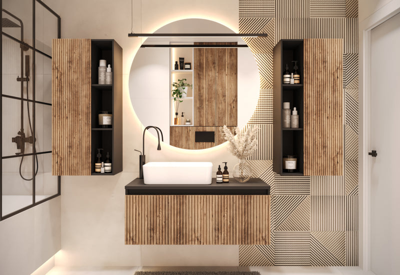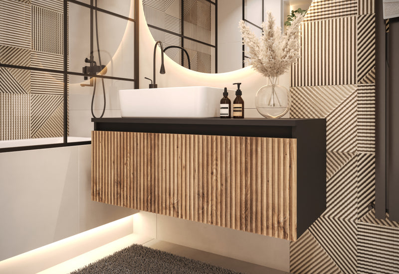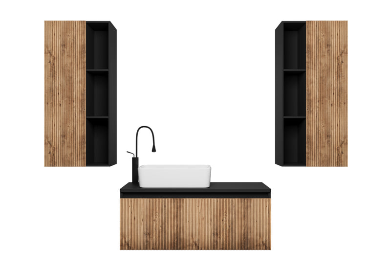 Kúpeľňová zostava WOTANA 2. Je vyrobená z kvalitného materiálu a vybavená ABS hranou. Tá ju chráni pred mechanickým poškodením a vlhkosťou. Zostava poskytuje dostatok úložného priestoru. Každá závesná skrinka má poličky za dvierkami a skrinka pod umývadlo má jednu zásuvku. Zostava vhodne kombinuje dekor dreva dub wotan s čiernou farbou a je určená na montáž na stenu. Súčasťou zostavy je skrinka pod umývadlo a dve závesné skrinky. Možnosť zakúpenia zostavy vrátane umývadla, batérie a sifónu.