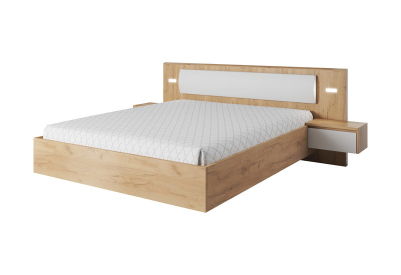 Manželská posteľ LOXEN. Praktická manželská posteľ doplnená roštom a zabudovanou doskou s nočnými stolíkmi. Zaujme svojim jednoduchým, moderným dizajnom. Je vyrobená z kvalitného materiálu a vrch dosky zdobí záhlavník. Posteľ je opatrená ABS hranami, ktoré chránia pred mechanickým poškodením a vlhkosťou. Nočné stolíky majú zásuvku a nad nimi sa nachádza LED osvetlenie. Kombinovať môžete s ďalšími produktmi z radu LOXEN.