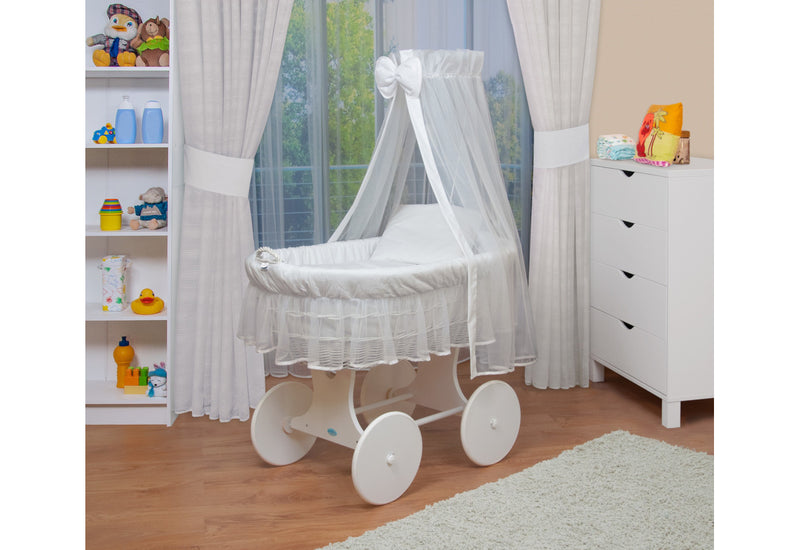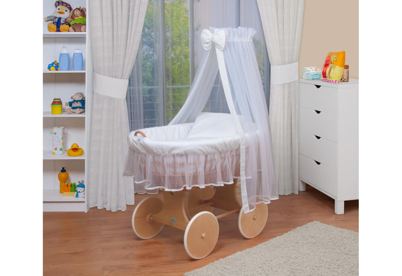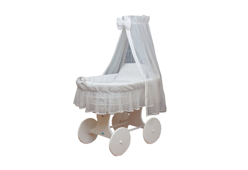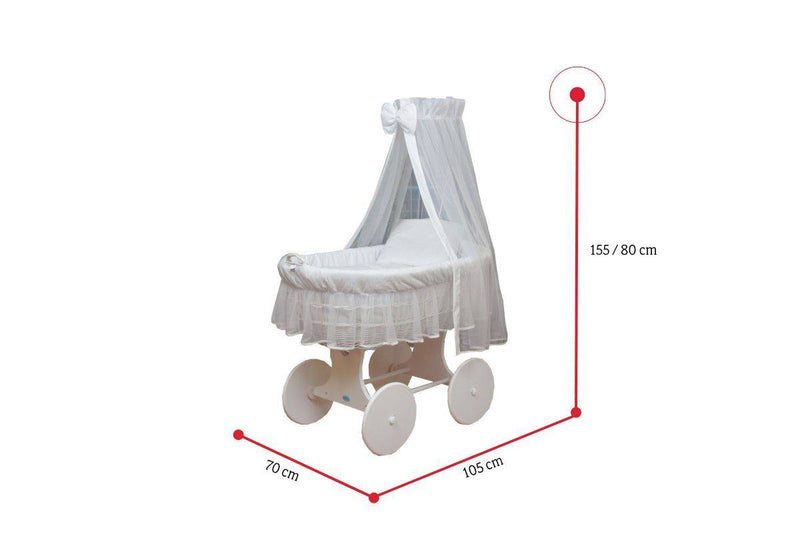 Mojžišov kôš DESIRO 2. Prútený Mojžišov kôš pre bábätko. Vyrobený je z kvalitných materiálov. Dodáva bábätku bezpečie. Ľahko odnímateľný. Súčasťou je penový matrac so snímateľným poťahom, nebesia s držiakom nebies, deka a vankúš. Korbička košíka je umiestnená na kolieskach, vďaka ktorým je možné s košíkom pohybovať a umiestniť ho kam potrebujete. Vhodný aj do menších izieb. Štýlový dizajn Mojžišového koša zútulní váš interiér spálne aj detskej izby. Možnosť výberu z dvoch dekorov.