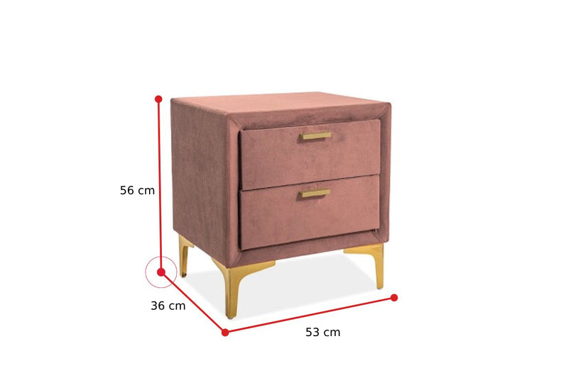 Nočný stolík COLLE skvele doplní vašej spálne. Kvalitná konštrukcia je potiahnutá zamatovo hebkú látkou. Elegantný vzhľad tvorí najmä čalúnenie a kovové nohy v zlatom prevedení. Úložný priestor stolíka je vo forme dvoch zásuviek. O ľahšie otváranie sa postarajú úzke úchyty.