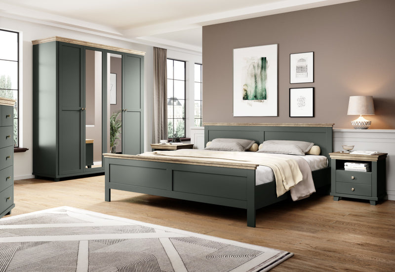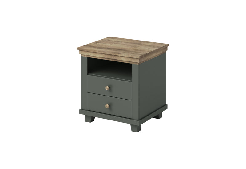 Nočný stolík DIVOR. Dizajn v štýle vintage. Vyrobený je z kvalitného materiálu a opatrený ABS hranami. Praktická odkladacia plocha so zásuvkami a otvoreným úložným priestorom. Ozdobná lišta a kovové úchytky s jemnými detailmi podčiarknu celý interiér. Možnosť výberu z viacerých dekorov. Produkt je možné zakúpiť jednotlivo, ale aj ako celú zostavu.
