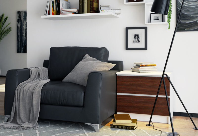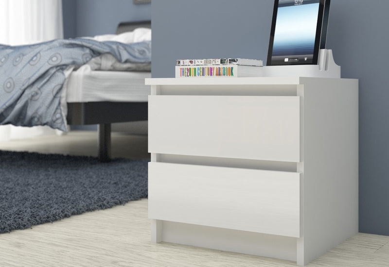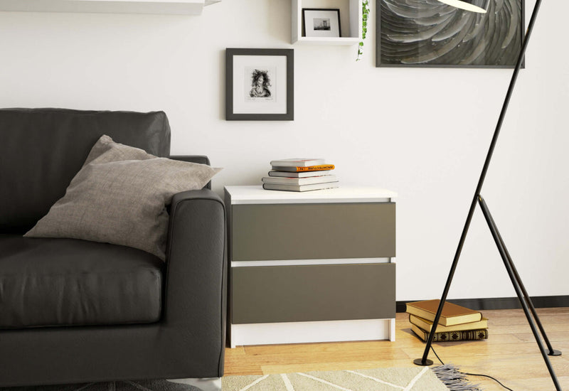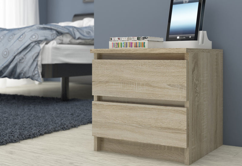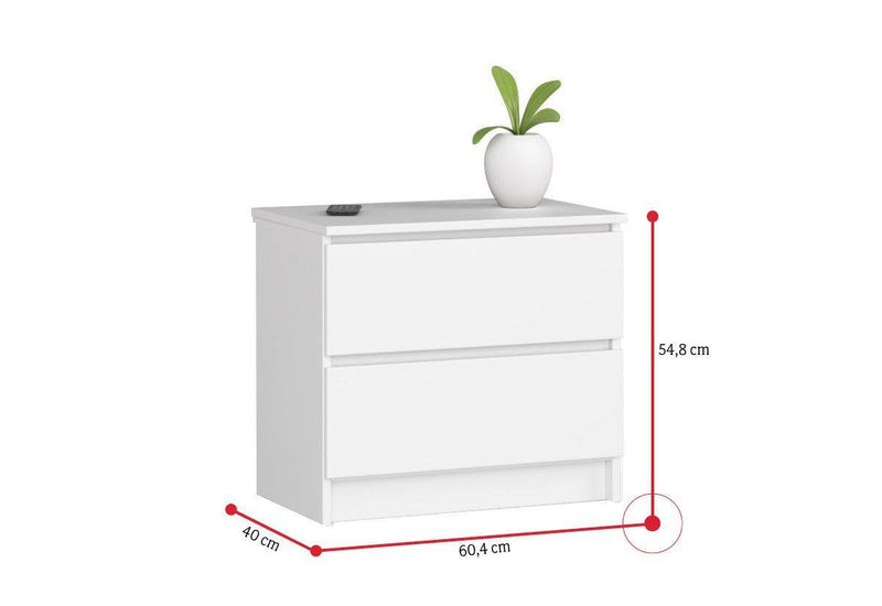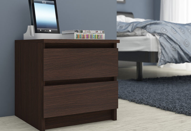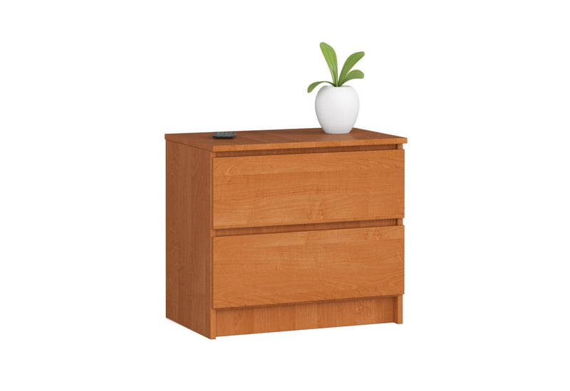 Nočný stolík LOLEK. Moderný nočný stolík zaujme svojim jednoduchým dizajnom. Je vyrobený z kvalitného materiálu a opatrený ABS hranou, ktorá chráni pred mechanickým poškodením a vlhkosťou. Vytvára dostatok priestoru v podobe vrchnej dosky a dvoch zásuviek. Možnosť výberu z viacerých dekorov.