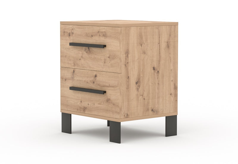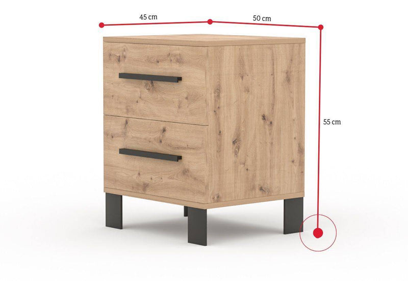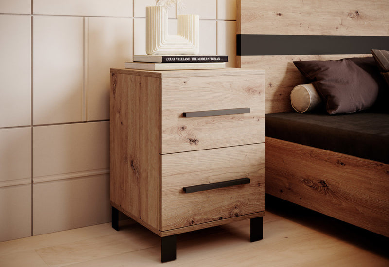 Nočný stolík MAKLEN. Moderný nočný stolík je vyrobený z kvalitného materiálu s hrúbkou 1,6 cm. Súčasťou je úložný priestor v podobe dvoch priestranných zásuviek. Vybavený je úzkymi úchytmi v čiernej farbe pre ľahšiu manipuláciu. Pre väčšiu stabilitu a vzdušnosť stojí na vyšších nožičkách v čiernej farbe. K dispozícii sú aj ďalšie produkty z rovnakého radu MAKLEN.