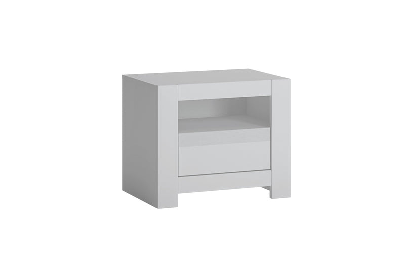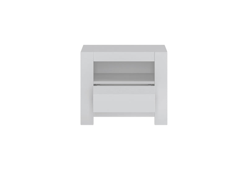 Nočný stolík MANOL. Moderný nočný stolík zaujme svojim jednoduchým dizajnom. Vyrobený je z kvalitných materiálov. Súčasťou je úložný priestor v podobe otvorenej police a priestrannej zásuvky s bezúchytovým systémom. Dostatok miesta ponúka aj horná doska nočného stolíka. Možnosť kombinovať s ďalšími produktmi z radu MANOL.