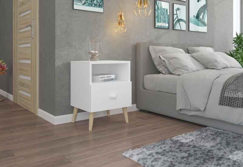 Nočný stolík TITUS. Je vyrobený z kvalitného materiálu s hrúbkou 1,8 cm. Pevná konštrukcia z kvalitnej dosky zaistí stabilitu a odolnosť proti poškodeniu. Stolík poskytuje dostatok úložného priestoru v podobe jednej zásuvky a otvorenej poličky. Stolík stojí na vyšších nožičkách. Na výber z niekoľkých dekorov.