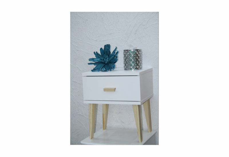 Nočný stolík WAIKIKI ponúka úložný priestor v jednej zásuvke a na vrchnej odkladacej ploche. Je vyrobený z masívneho borovicového dreva a laminátu. Jeho vzhľad dokresľujú nohy vo skosenom tvare.