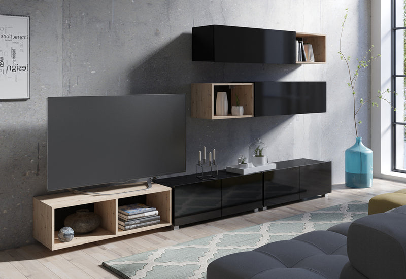 Obývacia stena BRINA. Zaujme Vás jednoduchými líniami modernej obývacej zostavy. Zostava je opatrená ABS hranou, ktorá chráni nábytok pred poškodením. Skladá sa z dvoch závesných skríň, dvoch TV stolíkov a troch otvorených políc. Tv stolíky a police majú nožičky, ktoré sa dajú zložiť a môžete si stolík, alebo policu zavesiť aj na stenu. Možnosť voľby dekoru.