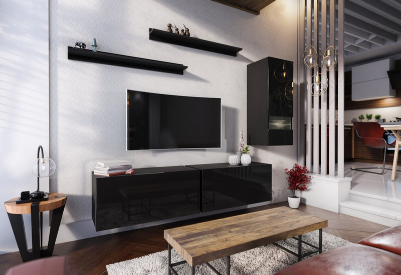 Obývacia stena ELPASO 10. Je vyrobeno z kvalitného materiálu opatreného ABS hranami. Dvierka sú bez úchytov a otvárajú sa pomocou systému PUSH TO OPEN. Táto stena obsahuje dve závesné skrinky, jednu závesnú presklenú skrinku a dve police. Presklenú časť skrinky môžete vybaviť LED osvetlením.