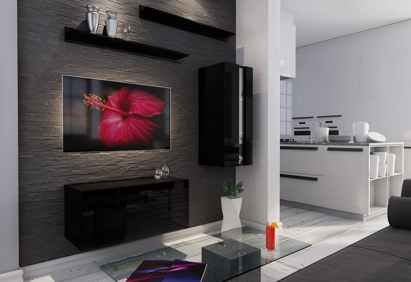 Obývacia stena ELPASO 11. Je vyrobená z kvalitného materiálu opatreného ABS hranami. Dvierka sú bez úchytov a otvárajú sa pomocou systému PUSH TO OPEN. Táto stena obsahuje jednu závesnú skrinku, jednu závesnú presklenú skrinku a dve police. Presklenú časť skrinky môžete vybaviť LED osvetlením.