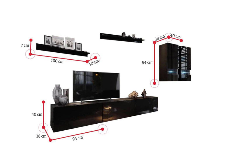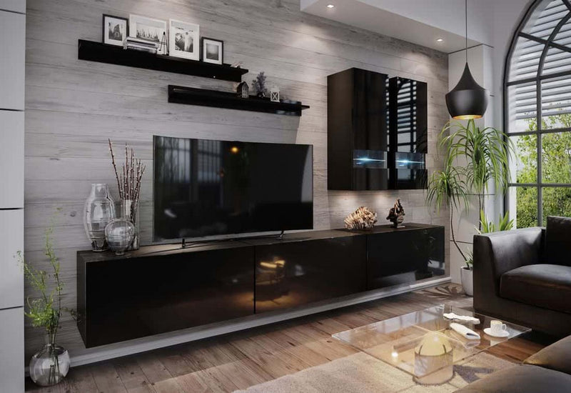 Obývacia stena ELPASO 1. Vyrobená z kvalitného materiálu s ABS hranami. Dvierka sú bez úchytov a otvárajú sa pomocou systému PUSH TO OPEN. Táto stena obsahuje tri závesné skrinky, dve závesné presklené skrinky a dve police. Presklené časti skriniek môžete vybaviť LED osvetlením.