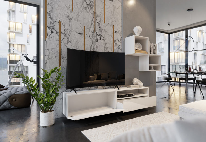 Obývacia stena ELPASO 29. Zaujme vás jednoduchými líniami modernej obývacej zostavy. Na výrobu sa použil kvalitný materiál s ABS hranami, ktorý chráni stenu pred poškodením. Dvere sú bez úchytov a otvárajú sa pomocou systému "PUSH TO OPEN". Táto stena obsahuje dve malé závesné skrinky a čiastočne otvorenú skrinku na TV. Môže byť nakonfigurovaná s osvetlením LED.