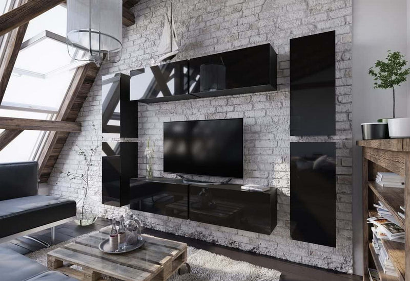 Obývacia stena ELPASO 2. Vyrobená je z kvalitného materiálu s ABS hranami. Dvierka sú bez úchytov a otvárajú sa pomocou systému PUSH TO OPEN. Táto stena obsahuje štyri veľké a štyri malé závesné skrinky.