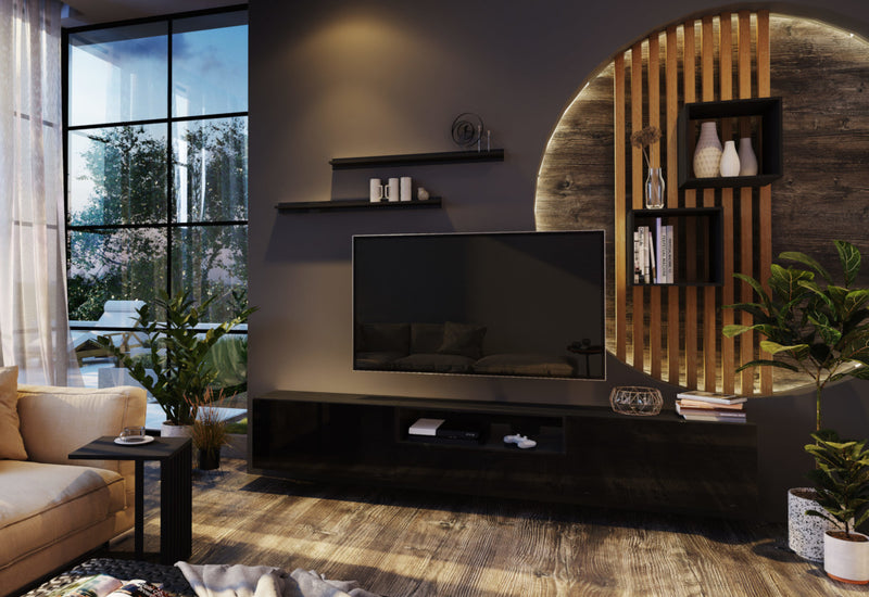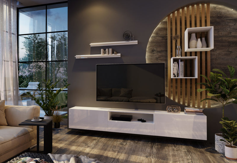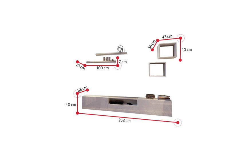 Obývacia stena ELPASO 30. Zaujme vás jednoduchými líniami modernej obývacej zostavy. Na výrobu sa použil kvalitný materiál s ABS hranami, ktorý chráni stenu pred poškodením. Dvere sú bez úchytov a otvárajú sa pomocou systému "PUSH TO OPEN". Obývacia stena obsahuje kombináciu políc a čiastočne otvorenej závesnej skrinky na TV. Môže byť nakonfigurovaná s osvetlením LED.