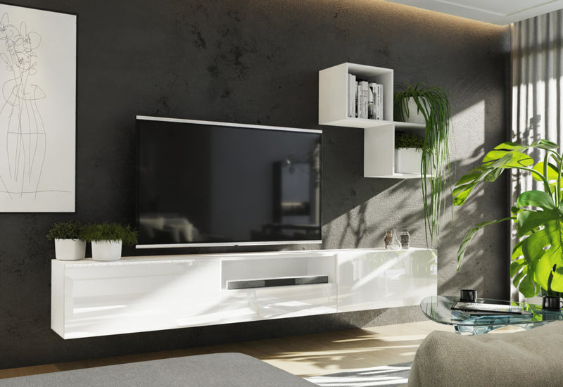 Obývacia stena ELPASO 35. Zaujme Vás jednoduchými líniami modernej obývacej zostavy. Pro výrobu obývacej steny pred poškodením bol použitý kvalitný materiál s ABS hranami. Dvierka sú bez úchytu a otvárajú sa pomocou systému PUSH TO OPEN. Obývacia stena obsahuje 2 poličky a čiastočne otvorenú závesnú TV skriňu. Možnosť konfigurácie s LED osvetlením.