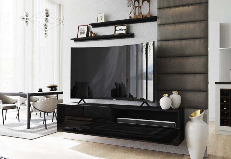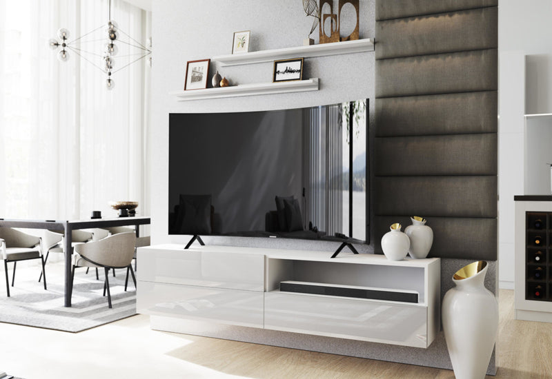 Obývacia stena ELPASO 37. Zaujme vás jednoduchými líniami modernej obývacej zostavy. Na výrobu bol použitý kvalitný materiál 1,6 cm s ABS hranami, ktoré chránia obývacia stenu pred poškodením a vlhkosťou. Dvierka sú bez úchytu a otvárajú sa pomocou systému PUSH TO OPEN. Obývacia stena obsahuje dve poličky a čiastočne otvorenú závesnú TV skrinku. Možnosť konfigurácie s LED osvetlením.
