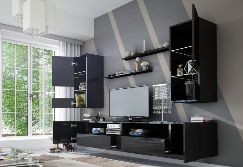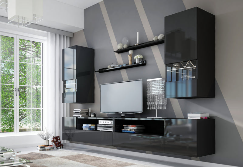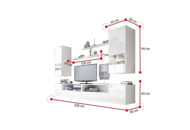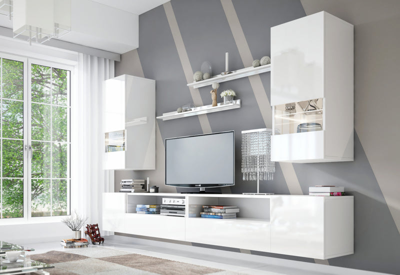 Obývacia stena ELPASO 41. Vyrobená je z kvalitného materiálu s hranami ABS. Zásuvky a dvierka TV stolíka sú bez úchytiek a otvárajú sa systémom "PUSH TO OPEN". Táto stena obsahuje dve sklenené skrinky, TV stolík zložený zo štyroch skriniek a dvoch políc. Sklenené časti skriniek môžu byť vybavené osvetlením LED. Môžete si vybrať z dvoch dekorov.