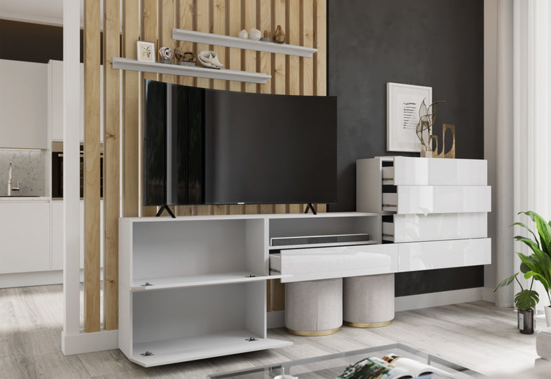 Obývacia stena ELPASO 52. Zaujme Vás jednoduchými líniami modernej obývacej zostavy. Na výrobu bol použitý kvalitný materiál opatrený ABS hranami, ktoré chránia obývaciu stenu pred poškodením. Dvierka sú bez úchytu a otvárajú sa pomocou systému PUSH TO OPEN. Obývacia stena obsahuje police, čiastočne otvorený TV stolík a závesné skrinky. Možnosť konfigurácie s LED osvetlením.
