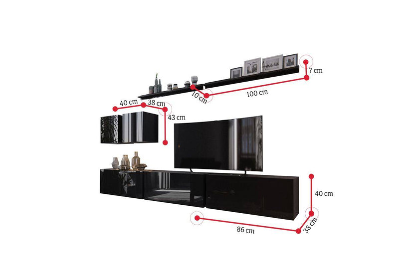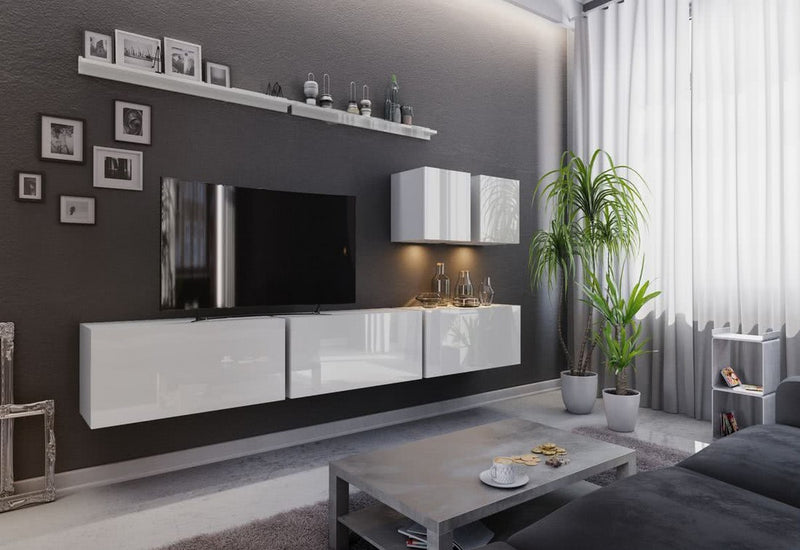 Obývacia stena ELPASO 7. Je vyrobená z kvalitného materiálu s ABS hranami. Dvierka sú bez úchytiek otvárajú sa pomocou systému PUSH TO OPEN. Skladá sa z troch veľkých a dvoch malých závesných skriniek s policou.