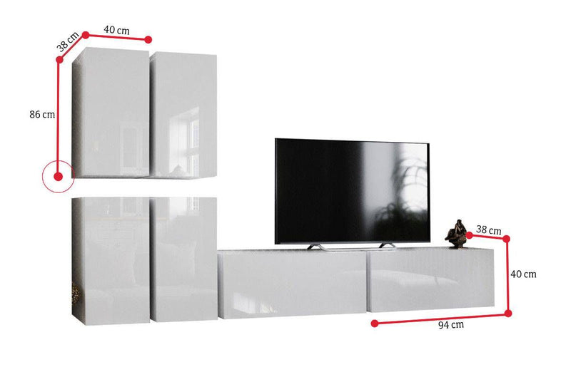 Obývacia stena ELPASO 8. Vyrobena je z kvalitného materiálu s hranami ABS. Dvierka sú bez úchytov a otvárajú sa pomocou systému PUSH TO OPEN. Táto stena sa skladá zo štyroch veľkých a dvoch malých závesných skriniek.