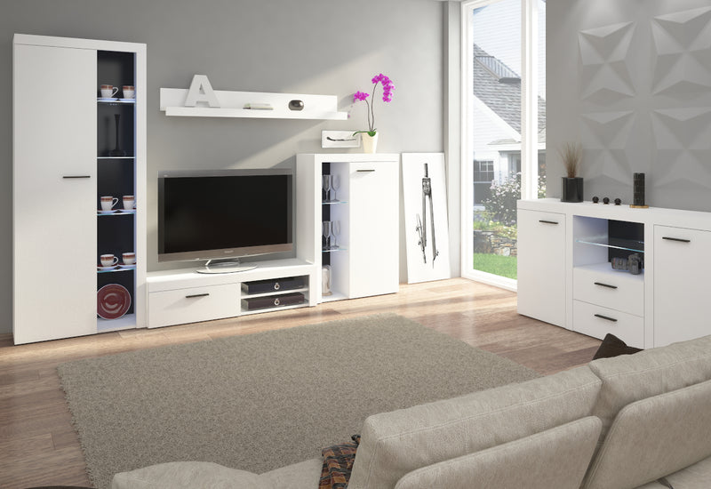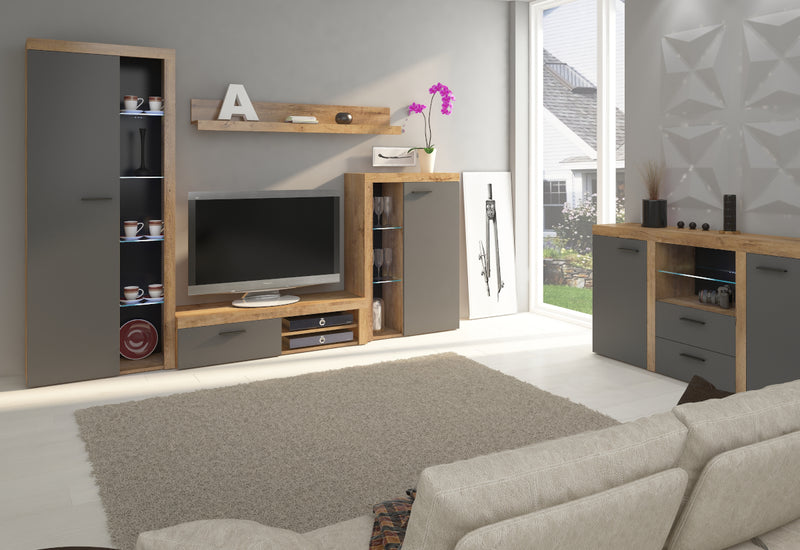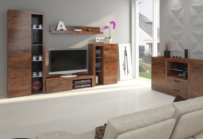 Obývacia stena KLOK. Moderný štýl v nadčasovom dizajne. Vyrobená je z kvalitného materiálu s hrúbkou 1,6 cm. Zostava sa skladá z TV stolíka, dvoch priestranných vitrín a jednej police. Všetko je opatrené úchytmi pre ľahšiu manipuláciu. Vybrať si môžete z viacerých dekorov. Ak vás zaujal tento dizajn, tak si určite pozrite aj ďalšie produkty z tejto série KLOK.