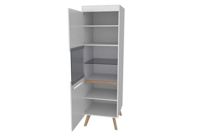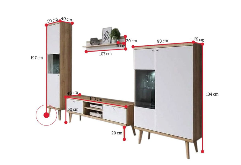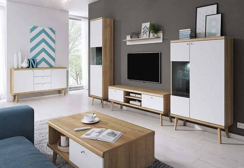 Obývacia stena PORT. Obsahuje dve vitríny, TV stolík a poličku. Vitríny sú presklené takže máte možnosť priobjednať si LED osvetlenie. Hrany sú opatrené ABS hranami. Všetky zásuvky a skrinky disponujú kovovým mechanizmom.