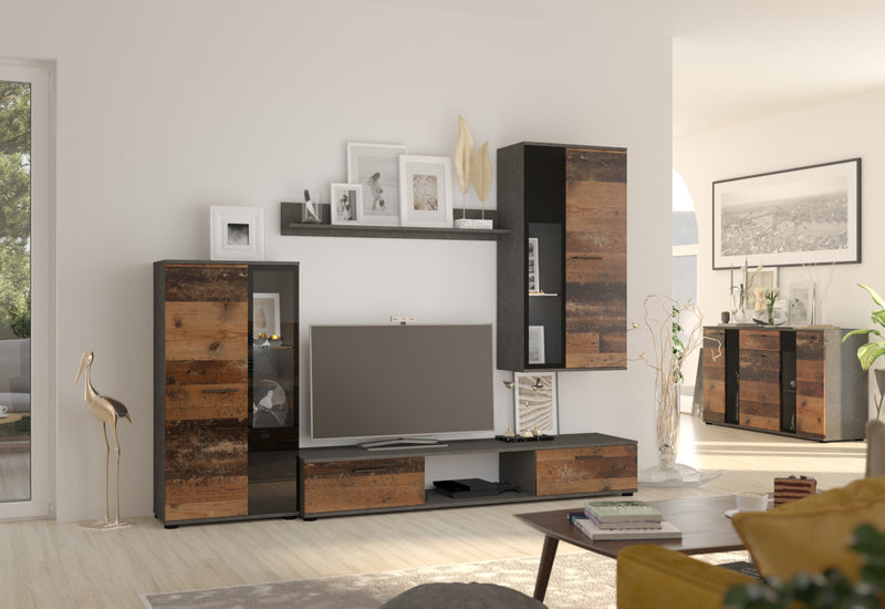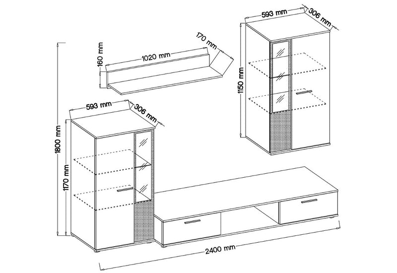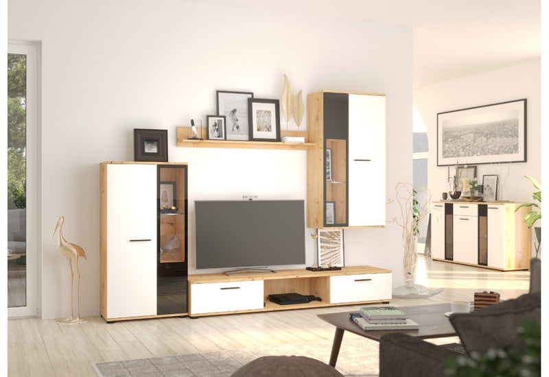 Zostava bola vyrobená z kvalitného materiálu. Súčasťou obývacej steny je TV stolík, vitrína, závesná skrinka a nad nimi sa vyníma priestranná polica. Vitrína a závesná skrinka obsahuje presklenú časť. Sklenené priestory je možné doplniť LED osvetlením. Za týmito dvierkami nájdete dve police, ktoré slúžia ako úložný priestor. Všetky dvierka majú jemné úchyty. TV stolík ponúka dva úložné priestory s dvierkami a jednu policu uprostred. Závesná polica bude skvelá pre vaše dekorácie v intriéri. Na výber máte z viac dekorov. Páči sa vám tento moderný dizajn? Ak áno, tak si rozhodne pozrite aj ďalšie produkty séria RUMBA.
