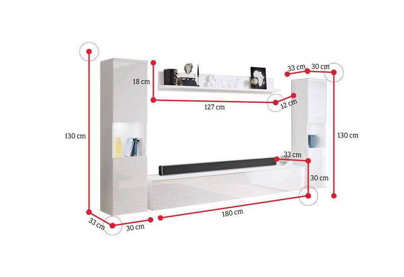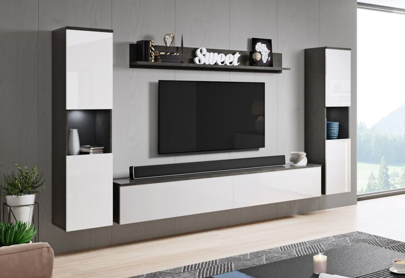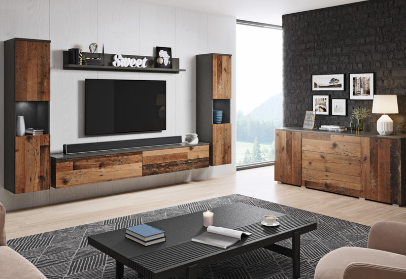 Obývacia stena URAL XL. Zostava zahŕňa dve vysoké skrinky, TV stolík a poličku. Jednotlivé komponenty sú vyrobené z kvalitného materiálu s hranami ABS, ktoré chhráni materiál pred mechanickým poškodením a vlhkosťou. Vysoká skrinka je za jednotlivými dvierkami rozdelená poličkou. Dvierka skriniek sú bez úchytov. Pri TV stolíku a skrinkách si môžete vybrať spôsob umiestnenia. Môže stáť na menších nôžkach alebo ich môžete zavesiť na stenu. Na výber máte z viacerých dekorov.