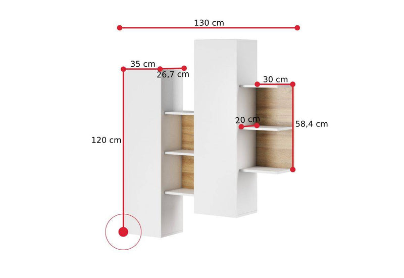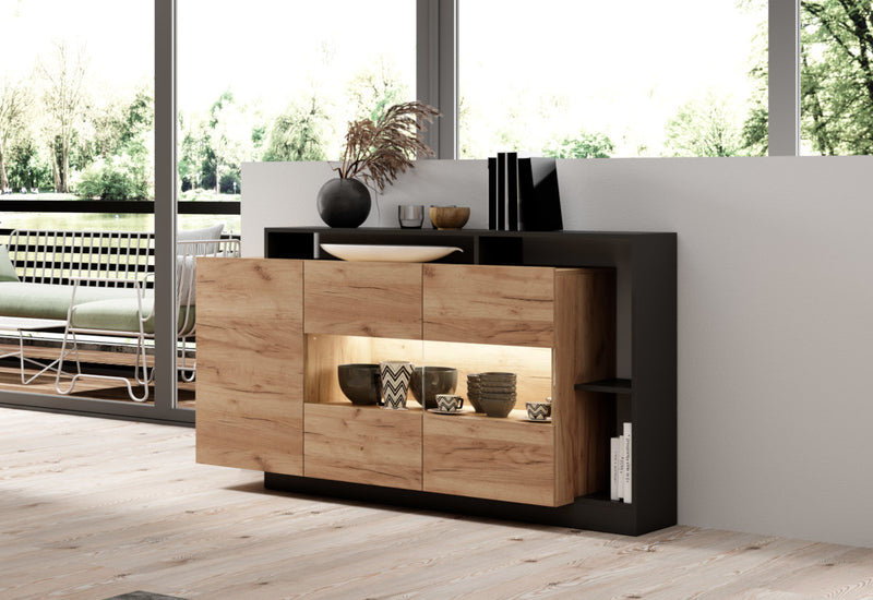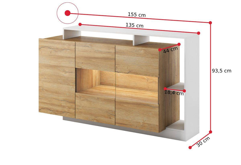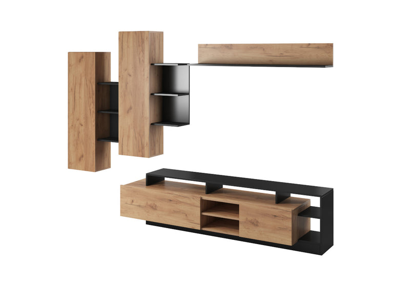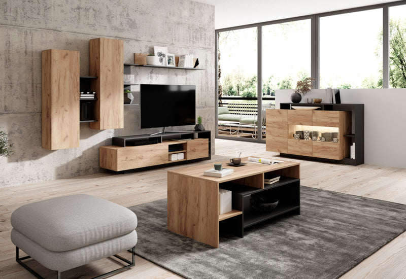 Obývacia zostava ALMEN. Vyrobená je z kvalitných materiálov a vybavená ABS hranou. Tá chráni pred mechanickým poškodením a vlhkosťou. Skladá sa z komody s LED osvetlením, závesných skriniek a poličiek, nástennej police, konferenčného a TV stolíka. Možnosť výberu z viacerých dekorov.