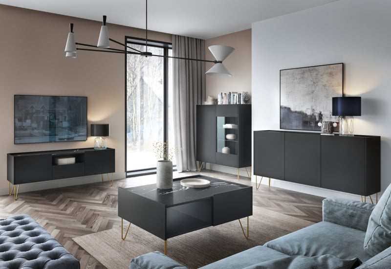 Obývacia zostava ARMON. Vyrobená je z kvalitného materiálu a je opatrená ABS hranami, ktoré chránia pred mechanickým poškodením a vlhkosťou. Zostava ponúka množstvo úložného priestoru. Skladá sa z komody, TV stolíka, konferenčného stolíka a vitríny. Na otváranie skriniek a zásuviek slúži vyčnievajúca hrana. Každý produkt v zostave môžete zakúpiť aj zvlášť.
