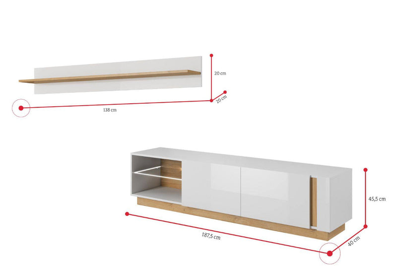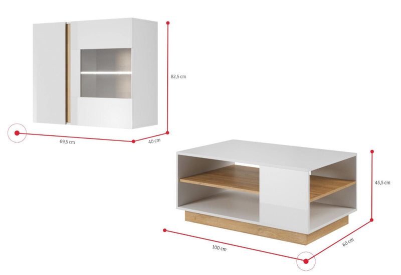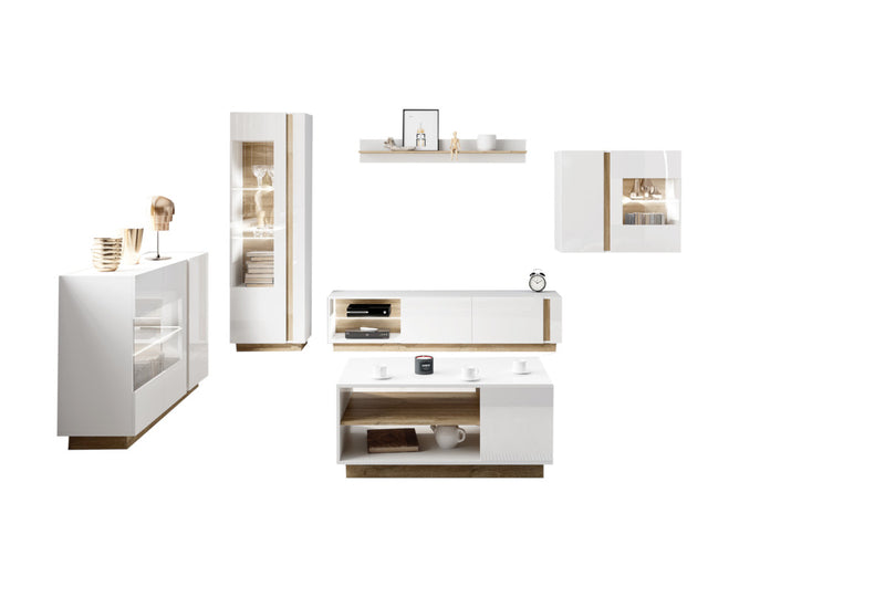 Obývacia zostava ARMONA. Vyrobená je z kvalitných materiálov a vybavená ABS hranou. Tá chráni pred mechanickým poškodením a vlhkosťou. Skladá sa z komody, vitríny, TV stolíka a závesnej vitríny, ktoré sú vrátane LED osvetlenia. Súčasťou je aj konferenčný stolík a nástenná polica. Komoda a TV stolík sa otvárajú pomocou systému PUSH TO OPEN. Korpus pri bielom dekore je v matnom prevedení, zatiaľ čo predná strana v lesku. Možnosť výberu z viacerých dekorov. Produkty je možné zakúpiť aj jednotlivo, čím si môžete obývaciu zostavu poskladať podľa svojho uváženia.