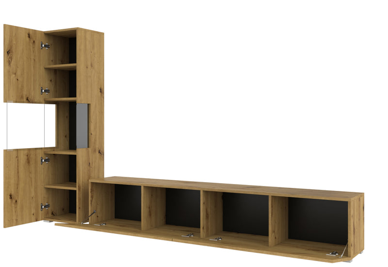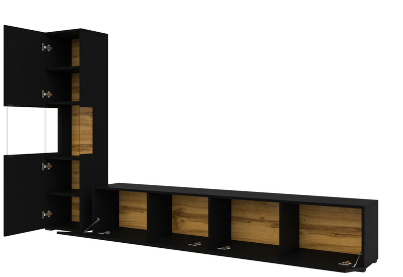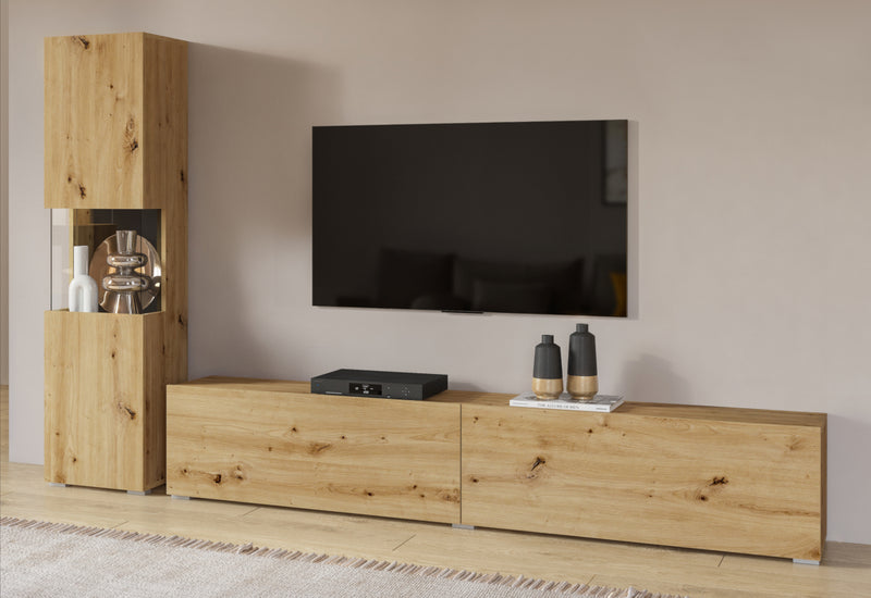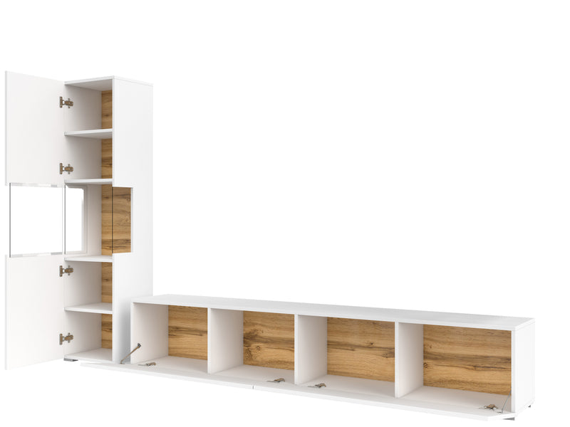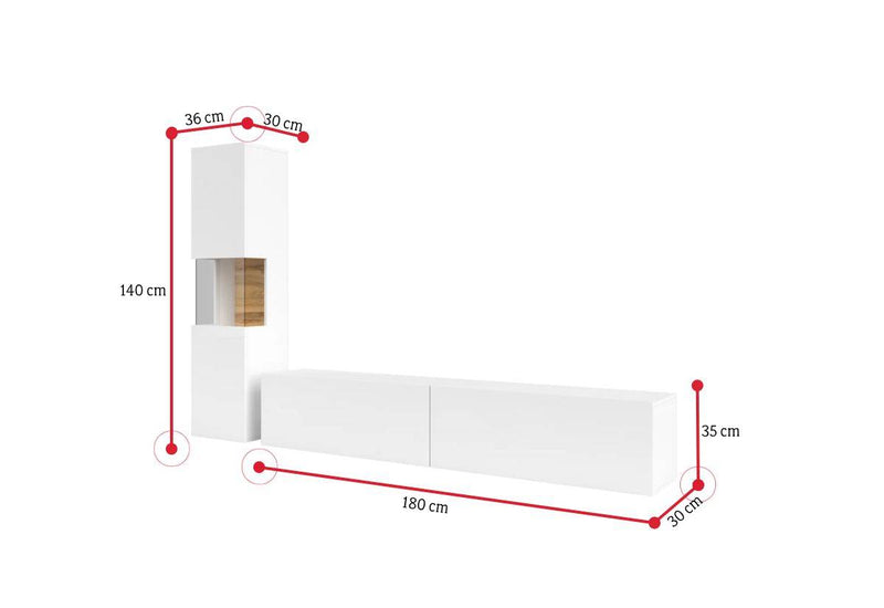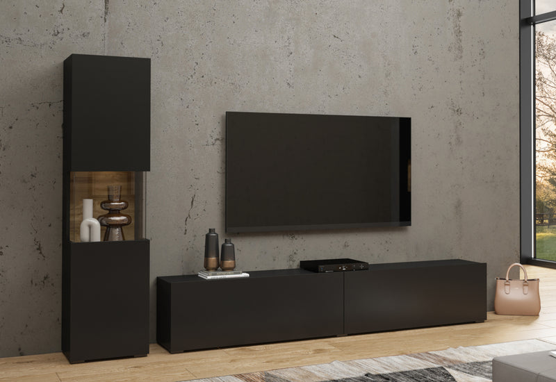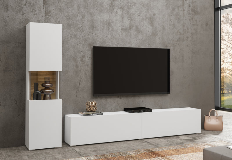Obývacia zostava AVANA. Zaujme vás jednoduchými líniami modernej obývacej zostavy. Na výrobu bol použitý kvalitný materiál s ABS hranami, ktoré chránia stenu pred poškodením. Táto zostava obsahuje vitrínu a TV stolík. Možnosť konfigurácie s LED osvetlením a s možnosťou zavesenia na stenu.